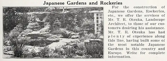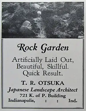 Ōtsuka likely began building rock gardens and Japanese-style gardens in the Chicago area soon after 1905, based on the date of his known and probable projects. During his career, Ōtsuka built numerous gardens in the Midwestern states, Florida, and upstate New York.[15] As T. R. Ōtsuka, he advertised widely between 1911 and the early 1930s in national magazines including Country Life, House Beautiful, and The Garden.