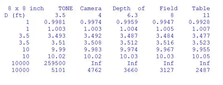 Depth of field table