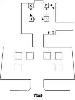 The Theban Tomb TT385 is located in Sheikh Abd el-Qurna, part of the Theban Necropolis, on the west bank of the Nile, opposite Luxor. It is the burial place of the ancient Egyptian Hunefer (Haunefer), who was a Mayor of the Southern City (Thebes)[1] during the reign of Ramesses II in the Nineteenth Dynasty.[2]