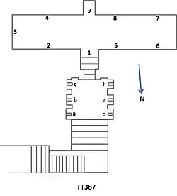 The Theban Tomb TT387 is located in El-Assasif, part of the Theban Necropolis, on the west bank of the Nile, opposite to Luxor. It is the burial place of Meryptah, the royal scribe of the table of the Lord of the Two Lands,[1] and the Governor of the Desert Lands for the Southern Deserts. His wife is a Lady of the House and a Chantress of Amun. Her name is Nebkhentu.[2]