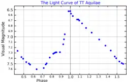 The visual apparent magnitude of TT Aql ranges from 6.52 to 7.65 over 13.7546 days.[3] The light curve is asymmetric, with the rise from minimum to maximum brightness only taking half the time of the fall from maximum to minimum.[11]