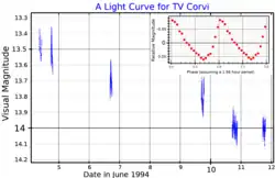 The system consists of a white dwarf and a donor companion which orbit around a common centre of gravity every 1.5096 hours (90.54 minutes).[6] The white dwarf sucks matter from the other star via its Roche lobe onto an accretion disc which is heated and changes viscosity before collapsing, typically reaching magnitude 13 in these outbursts and remaining near magnitude 19 when quiet.[2] In TV Corvi, these outbursts can be split into frequent eruptions and two types of less frequent supereruptions, behaviour found in a group of dwarf novae known as SU Ursae Majoris stars.[5] The AAVSO has recorded maxima as bright as visual magnitude 12.2.[7]
