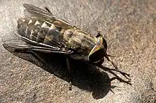 Tabanus autumnalis, the large marsh horsefly, is a medium-sized species of biting horse-fly. It is somewhat scarce compared to T. bromius and T. bovinus. This species shows slightly more of a preference for coastal marsh than some of the other European Tabanus, sometime even found in saltmashes. Wing length is 13–16 mm and about 16–22 mm in body length.[4][5][6]