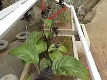 There are ten species in the genus Tacca.[5] T. chantrieri is often referred to as the bat flower, devil flower, or cat whiskers.[6] It is an unusual plant in that it has black flowers. T. chantrieri has bracts that look like wings and are large in area. The flower can be up to 12 inches across.[5] Its height can range anywhere from 50–100 cm tall. The bracteoles look like long whiskers hanging from a bat that can be 8-10 inches in length.[2] Some researchers believe that the bracteoles have photosynthetic properties.[6]