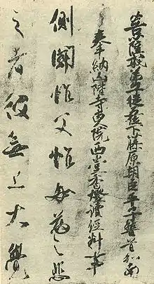 Tachibana no Hayanari (橘 逸勢, 782 - September 24, 844) was a Heian period Japanese government official, calligrapher and member of the Tachibana family. He travelled to China in 804, returning in 806, and dying exiled in Izu Province for participation in an imperial succession controversy. His most famous calligraphic work is the Ito Naishin'no Ganmon (伊都内親王願文), now in the Imperial Household collection.