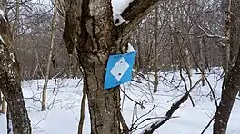 The trail is marked with blue squares containing white blazes throughout its length. All NYSDEC portions of the trail are also posted with blue DEC markers. The trail follows a series of high, open summits and ridgeline overlooking the Hudson River Valley to the west. The entirety of the trail is open to hiking, backpacking, snowshoeing, cross-country skiing, and backcountry skiing, and many sections permit mountain biking, horseback riding and snowmobiling as well.[1] Overnight camping is allowed on the trail; a seasonal campground with facilities is located at Berry Pond.