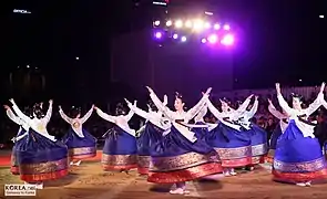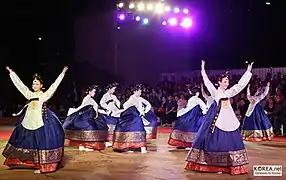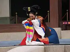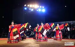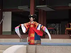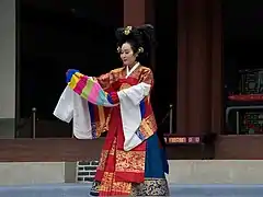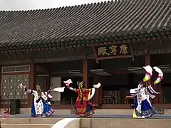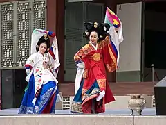 Taepyeongmu (태평무; literally "great peace dance") is a Korean dance with the function of wishing a great peace for the country. Its exact origin is unknown, but certain style of the present was composed by Hahn Seongjun (hangul: 한성준; hanja: 韓成俊; 1874–1941), an outstanding master of Korean dance in the beginning of last century. There are three assumptions regarding the origin of Taepyeongmu. One is a court dance occasionally performed by kings during the Joseon dynasty. Therefore, the costumes used by the dancers are similar to the gwanbok (hangul: 관복; literally "official clothing") formerly worn by Korea's kings and queens.[1]
