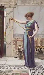 The tainia headband was worn with the traditional ancient Greek costume. The headbands were worn at Greek festivals.[1] The gods also bound their heads with tainiai.[2] Furthermore, cult images,[3] trees,[4] urns, monuments, animal sacrifices and the deceased[5] had tainiai wound around them. They were later adopted by the Romans.[6] A similar type of headband was the diadema, used as a symbol for kings.