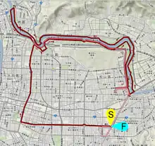 The course first heads west along Renai Road into the Zhongzheng District and wanders around the area for about 5 km (3 mi).[3] Runners then head north along Zhongshan Road, and cross the Keelung River.[3] The marathon then roughly follows the river east until making a turnaround near the Nangang Exhibition Center, and then roughly follows the south side of the river back west to Yingfeng Dog Park.[3] Afterward, the course heads south and then west, eventually joining up with Nanjing Road before finishing inside Taipei Stadium.[3]