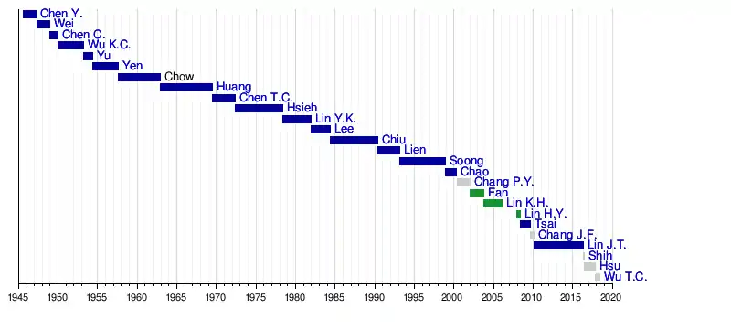 - ↑ 歷任首長 [Past Chiefs]. tpg.gov.tw (in Chinese). Taiwan Provincial Gov't. Retrieved February 22, 2017.
