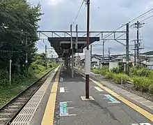 The station has one island platform serving two tracks and connected to the station building by a level crossing. The station is staffed.