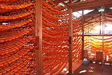 As sericulture lost its place in the area during the Taisho period, the former village of Isazawa in Yanagawa replaced it with the production of dried persimmons, among other industries. Dried persimmons had been produced in the area since the Edo Period. However, the addition of sulfur fumigation as was used in the production of raisins in the United States, allowed for a much sweeter product. Whereas traditional dried persimmons, hoshigaki, have a tough skin and are almost black in color, those created with the additional step of sulfur fumigation, called anpogaki or tsurushigaki, are soft and bright orange.