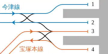 | 4 | ■ Takarazuka Line | for Kiyoshikōjin, Nakayama-kannon, Kawanishi-Noseguchi, Ōsaka (Umeda), Minoo, and Kyōto |