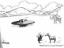 It is believed to have originated in a 1953 cartoon by Alex Graham in The New Yorker magazine. The cartoon depicted two aliens telling a horse "Kindly take us to your President!"[1][2]