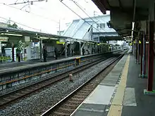 The station has two opposed side platforms serving two tracks, with an elevated station building above the tracks and platforms.