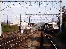 The station has an island platform and a side platform connected to the station building by a level crossing. The station building has both a staffed service counter and automatic ticket machines.