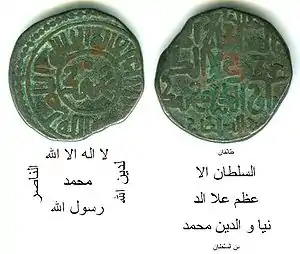 A coin minted in Taloqan under Muhammad II of Khwarezm (1200–1220).