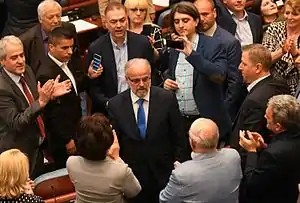 In April 2017, Xhaferi was elected President of the Macedonian parliament, supported by a coalition of Albanian national parties and the opposition social-democratic SDSM party, sparking riots in the parliament building.[9] The VMRO-DPMNE party labeled this move as a coup.[10] Subsequently, demonstrators broke into the parliament building, beating journalists and MPs, and had to be cleared by the police.[9][11]