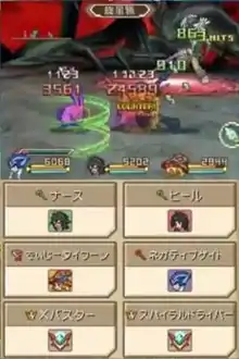 The battle system is a variant on the Linear Motion Battle System (LMBS) from multiple Tales titles: an action-based combat system similar to a fighting game: button commands instantly trigger various attacks and actions, and different attacks string together to form combos.[6][11] The system used in Hearts is called the "Combination Aerial LMBS". Up to three characters participate in battle, with one controlled by the player and the other two controlled via artificial intelligence. The two AI characters be assigned to perform different actions such as healing or attacking.[6][11] The "Combination" element refers to a special gauge that fills up and can be used to perform special attacks with party members not assigned in battle. A second "Emotion" gauge determines how many moves a character can perform: the gauge fills while the character is blocking, and is depleted by performing actions. The lower the gauge is, the lower a character's defenses are.[6][10] Characters can employ special attacks called "Combination Blasters," Hearts' take on the series' staple Mystic Artes ("Hi-Ougis" in the Japanese version).[12] Defeated enemies drop items and materials that can be used to level up character abilities, with certain combinations of items yielding certain abilities and skills. Once enough skills have been learned, a character's weapon can be upgraded via three separate skill trees, with the abilities and power of the character changing according to the choice of skills beforehand.[11]