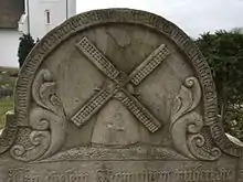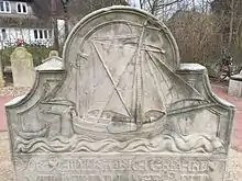 Many gravestones are decorated with depictions of ships. Typical vessels represented include fishing smacks, galiots, tjalks, koffs, brigs, barques, whalers and armed cargo ships (Handelsfregatten). However, these ship carvings did not necessarily mean the deceased was a sailor; rather, they symbolized the voyage of life or, when anchored in a harbor, the end of life's journey. Other designs include a Dutch windmill on the gravestone of the seafarer and later miller Erk Knudten (1733–1801), and a man in a Sunday suit on the marker of the church sacristan Hark Knudten.[11] Flowers on gravestones are thought to represent a full life, although broken stalks denote relatives of the deceased that had died earlier.[12]