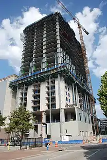 The history of skyscrapers in the city began with the construction of the original Binz Building in 1895. This building, rising 6 floors, is often regarded as the first skyscraper in Houston; it was demolished in 1951 to allow for the construction of a more modern building of the same name, which was in turn replaced by another, 14-floor-tall high-rise that also kept the original name.[8] Houston's first building standing more than 492 feet (150 m) was the El Paso Energy Building, completed in 1962.[9] After the Texas real estate collapse in late 1980s, the city saw no new major office buildings until 2002, when 1500 Louisiana Street was completed.[10] There are currently four buildings under construction that are planned to rise at least 427 feet (130 m).[11][2][3] Overall, the Council on Tall Buildings and Urban Habitat ranks Houston's skyline (based on existing and under construction buildings over 492 feet (150 m) tall) 2nd in the Southern United States (after Miami) and 4th in the United States.[lower-alpha 1]