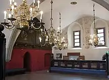 The fiber of the first floor's western side is similar to the cellar under it – its edgeline vault is carried by four low tetrahedral pillars. In the Middle Ages there was supposedly a so-called trade hall here where new goods were introduced and bargains were made. The room on the eastern side from the trade hall, whose vaults lean on identical tetrahedral pillars, was a torture chamber in the Middle Ages. The room was connected by the staircases built in the northern wall, with the parlour of the Town Hall on the second floor where a court was located. From the two eastern rooms, the one in the south was a coffer, from which there was access to the second floor in the accounting room (kämmerei) by the staircases located in the city wall. As a treasury, the room located in the north is also covered with a barrel vault. This room's city wall held an oven (kalorifeer) before, to heat the parlour with warm air.[21]