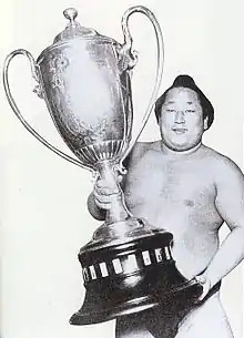 Tamanishiki holding the Emperor's Cup