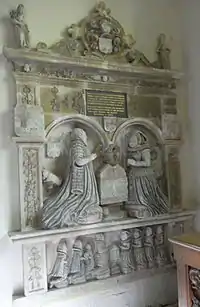 John IV Copleston (1546/9 – 1608) (second son and heir, by father's second marriage) of Copleston, who married Susan Pollard, a daughter of Lewis II Pollard (d. bef. 1569) of King's Nympton, Recorder of Exeter and Sergeant-at-Law, grandson of Sir Lewis I Pollard (c. 1465 – 1526), Justice of the Common Pleas.[21] The couple's monument, erected in 1617 and repaired in 1894, survives in St Mary's Church, Tamerton Foliot,[22] inscribed in Latin as follows: