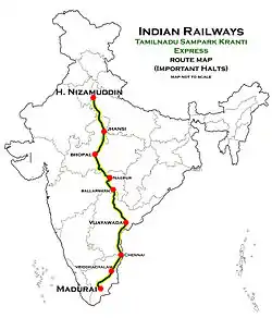 The 12651 / 12652 Tamil Nadu Sampark Kranti Express is one of the Sampark Kranti Express trains, operating on India's broad-gauge network that connects Madurai Junction in Tamil Nadu and Hazrat Nizamuddin in New Delhi, a distance of approximately 2,676 kilometres (1,663 mi) in 42 hours approximately, maintaining an average speed of 63 km/h (39 mph). From April 2021, it runs with newly manufactured highly refurbished LHB rakes.