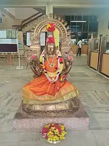 The goddess of Tamil Thai has been depicted variously in different media. Since the coinage of the concept and terminology of Tamil Thai by Manonmaniam Sundaram Pillai, the persona of Tamil Thai has been presented in a variety of ways in the print media via books, posters, paintings, in textbook illustrations, advertisements, and cartoons.[13] The depiction of this entity has been influenced by the Hindu goddess Saraswati, who has adopted some of her aspects, most significantly, her veena.[14] Saraswati, often known in Tamil as Kalaimakal, has sometimes been represented as Tamil Thai's friend, who commands poets to sing to her in Tamil so that she could enjoy listening to the language, as well as offering her friend most of her iconography.[15] Statues of Tamil Thai have been imagined and sculpted in several different forms. For example, in 1940, as directed by Ganesan, Vaidyanatha Stapathi created a panchaloha idol of Tamil Thai, depicting Tamil Thai as seated on a globe to indicate the geographical spread of Tamil. In this statue, Tamil Thai holds in her hands palm leaf manuscripts, a japa mala, the torch of knowledge, and a Sengottu yal.[10] The statue installed to commemorate the Fifth International Tamil Conference, Madurai, 1981, depicts Tamil Thai in a seated position sitting on a lotus flower with one hand in the abhaya mudra. A nearly identical statue has been installed as the main idol in the Tamil Thai Temple in Karaikudi. In some areas, Andal is considered to be Tamil Thai, due to her contribution to Tamil literature. The statue proposed to be installed at Madurai represents Tamil Thai in a standing position.[10]