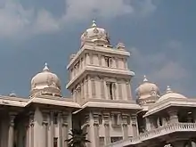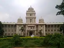 The university is situated in a campus of about 900 acres (3.6 km2), granted by the State government of Tamil Nadu, making it the largest university in the state by area. Buildings and blocks for the administrative and academic departments are located in the campus. The administrative block with its gopuram motif can be seen from the National Highway connecting Thanjavur with Trichy. The library is reminiscent of the Indian Parliament at New Delhi.[1] The Karikalan Gallery, built on the occasion of the World Tamil Conference is capable of accommodating about 2000 people.[2]