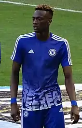 His form at youth level caught the attention of interim manager Guus Hiddink who invited him to train with the first team at the back end of the 2015–16 season.[8] On 11 May 2016, Hiddink handed Abraham his Chelsea debut in a 1–1 Premier League draw with Liverpool, bringing him on to replace Bertrand Traoré in the 74th minute.[9] Abraham then made his home debut at Stamford Bridge the following week, once again coming on as a second-half substitute for Traoré in a 1–1 draw with newly crowned Premier League Champions Leicester City.[7]