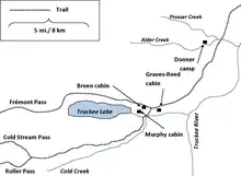 Over the course of the journey, some families in the Donner Party moved faster than others, resulting in the group separating into smaller sections.[29] The two Donner families lagged to the rear of the party at large, and after a heavy snowstorm they were left seven miles behind the rest of the party at Alder Creek.[30] Tamsen Donner wanted to continue onward into the mountains but was overruled by George and Jacob Donner, who decided to set up camp at Alder Creek.[30] While stuck, Donner would brush her daughters' hair daily while telling them Bible stories.[31] She also wrote, sketched, knit, and sewed, all while telling her daughters the stories "of 'Joseph in Egypt,' of 'Daniel in the den of lions,' of 'Elijah healing the widow's son'".[32] Donner's daughter, Georgia, later recalled of this time that Tamsen had said "that we children had not had a dry garment on in more than a week, and that she did not know what to do about it".[33]