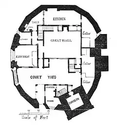 Originally entry to the castle grounds was by a gateway (little of which now remains) fronting onto the town's market-place. In his itinerary of Britain (1539/43), John Leland found the outworks “cleane decayed and the Wall fallen downe”, although on the mound there remained “a great round Tower of Stone, wherein Mr [Humphrey] Ferrers dwelleth, and now repaireth it.”[9]