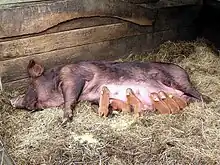 The Tamworth is a British breed of domestic pig. It is the only red-coloured British pig.[4]: 700 Its origins are unknown, but it appears to have developed near the town of Tamworth in south-eastern Staffordshire, close to Warwickshire border.[4]: 700 It is one of seven British pig breeds listed by the Rare Breeds Survival Trust as 'priority', the highest level of concern of the trust.[5]