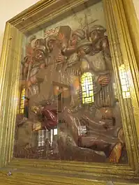The 14 Stations of the Cross inside the church is considered one of the most beautiful Stations of the Cross in Asia.[2] The carvings are depicted to have Malay features as evidenced by the brown skin of the natives and their squat figures, all of which are believed to have created by native Tanay artists. Some distinct depictions are borrowed from the native culture such as the "Tambuli" made of carabao and the bolo instead of the typical Roman sword. The carvings are encased in large glass windows across each side of the church.