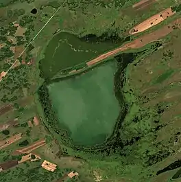 With an area of 87.8 square kilometers (33.9 sq mi) Tandovo is one of the largest lakes in Novosibirsk Oblast. It is located in the Baraba Lowland, southern sector of the West Siberian Plain, 33 kilometers (21 mi) SW of Barabinsk. The lake lies 8 kilometers (5.0 mi) to the north of the northeastern end of Lake Chany, in the endorheic basin between the Ob and Irtysh rivers.[4] In the northern half of the lake, the 7 kilometers (4.3 mi) long and 0.5 kilometers (0.31 mi) wide Sugun Peninsula almost cuts lake Tandovo in two.[1][5][6]