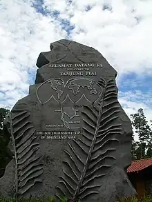 Tanjung Piai (Jawi: تنجوڠ ڤياي) is a cape in Pontian District, Johor, Malaysia. It is the southernmost point of Peninsular Malaysia and thus the most southern point of mainland Eurasia. The skyline of Singapore is visible across the Johor Strait from the point. It features seafood restaurants, perched on wooden jetties that are surrounded by a rugged and rarefied coastline of unspoiled mangrove forests.