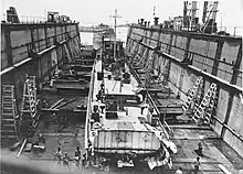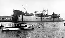 For construction of the drydock Burgerhout shipyard cooperated with Hamburger Dockbaubüro of Paul Matthiessen and Max Müller, who also designed the dock. On 17 October 1922 the first part of the drydock, consisting of four pontoons, was launched.[12] On 10 February 1923 the second part of the dry dock was launched.[13] The shipyard did not make the planned end date in March 1923, because the plans were later changed to include a power station.