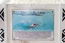 Local Chinese people referring the place as Den Foh Liew, which in Hakka means "lighthouse" due to a lighthouse on a nearby island of Kalampunian Island can be seen from here.[2] The lighthouse also serves as a reminder of treacherous coastline and past shipwrecks since during the Chinese dynasties era of Song, Ming and Qing, many Chinese trading vessels were capsized while on their way to Celebes Islands, to reach Moluccas (which is known as the Spice Islands).[2][5][6] During the famous circumnavigation era, Ferdinand Magellan fleet supposedly went here to perform repairs on his ships.[n 1][2][4]