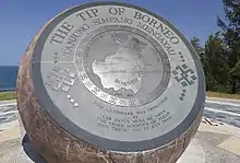 The tip is one of Sabah's popular tourist attractions.[3] Within the area, there is a park-like grounds with a Malaysian flag pole and a large bronze globe which opened since 2004.[1][7] The bronze globe marks the location of the Borneo Island tip at latitude 7 degrees north and longitude 116 degrees east with a map featuring the island embossed in bronze and laid on a flat surface at an angle with inscriptions to mark the tip. Over the years, several infrastructure and public amenities have been erected at the site which including a public rest area with a café, souvenir shop and washrooms.[1] In the park-like grounds, it has become one of the destination to view sunsets and full moons.[2]