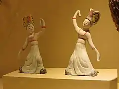 In the early Tang dynasty up to the late 8th century,[4] banbi were also popular among women, including noble and common women.[16] According to the New Book of Tang, "banbi, skirt, and ru are common clothes for maids served at the Eastern Palace".[16] In the 7th century, palace women could wear banbi over a plain shirt and a high-waisted, A-line skirts which could be monochrome or striped.[4] In the Tang dynasty, new styles of Tanling banbi appeared and became extremely popular.[14] Some shapes of banbi (such as the tanling banbi) worn in the early Tang appears to have been mainly influenced by the banbi worn in Qiuci.[16] Figures wearing banbi and striped skirt holding a shawl (pipo) and wearing low cut upper garments appear on the murals of Kizil Grottoes in Xinjiang; the shape and matching garments customs were similar to the early Tang dynasty's women clothing attire.[16] In the first decade of the 8th century, skirts in monochrome colours became more popular than stripped skirts.[9]: 85 By the mid-Tang dynasty around the mid-8th century, upper garments with low décolletage lost popularity and women started to cover themselves with shawl; there were also new ideals of beauty favouring extremely plum and voluptuous women over the youthful slenderness of the Sui and the early Tang dynasties.[12]: 25