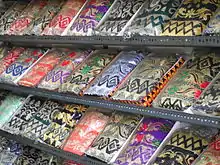 Tapis (Surat Ulu: ꤳꤶꥇꤼ꥓; Indonesian: kain tapis or simply tapis) is a traditional Tenun style and also refers to resulting cloth that originated from Lampung, Indonesia.[5][6][7][8] It consists of a striped, naturally-coloured cloth embroidered with warped and couched gold thread. Traditionally using floral motifs, it has numerous variations. It is generally worn ceremonially, although it can be used as a decoration. It is considered one of the symbols of Lampung and Lampungese.[9]
