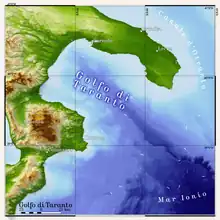 The Gulf of Taranto (Italian: Golfo di Taranto; Tarantino: Gurfe de Tarde; Latin: Sinus Tarentinus) is a gulf of the Ionian Sea, in Southern Italy.