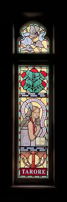 Tarore stained glass window, St Aidan's Anglican Church, Auckland, commissioned 2011. Three pīwakawaka (fantails) above symbolise the Trinity. The informal flower image represents youth. Tarore holds a copy of the Gospel of Luke in te reo Māori. The words around her head translate from te reo as "Peace be with you". Below is the tree of life, a Joshua Tree.