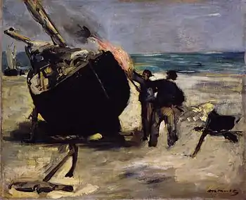 Tarring a Boat (French - Le Bateau goudronné) is an 1873 oil-on-canvas painting by Édouard Manet, painted at Berck beach during one of his regular summer stays in Boulogne-sur-Mer. It shows the hull of a fishing boat being tarred. In it he used a darker palette than usual, typical of his work of that period. It is now in the Barnes Foundation in Philadelphia.[1]