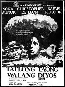 Tatlong Taong Walang Diyos (lit. 'Three Years Without God') is a 1976 Filipino period film written and directed by Mario O'Hara that set in the province of Laguna during the Second World War. The film stars Nora Aunor as the barrio lass Rosario, Christopher De Leon as the Japanese-Filipino army officer Masugi, and Bembol Roco as the army guerilla member Crispin.