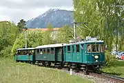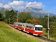 The Tatra Electric Railway (Slovak: Tatranská elektrická železnica), colloquially Tatra Railway, is an electrified (1500 V DC) single track 1,000 mm (3 ft 3+38 in) narrow gauge railway in the Slovak part of the Tatra mountains. It consists of two connected lines: