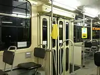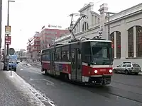 Tatra T6A5 is a unidirectional high-floor Czech streetcar made for public transport in Europe and is one sub-type of T6 standard trams made by Czech light rail supplier Tatra ČKD in Prague. Five cities, namely Bratislava, Košice in Slovakia and Brno, Prague and Ostrava in Czech Republic operate them in various configurations and amounts. The vehicle was designed as successor to Tatra T3 which has been operated in Europe for more than three decades at the time T6A5 was launched. The launch customer was Dopravný podnik Bratislava which received the first set of two vehicles in 1991. Brno, Bratislava, Ostrava and Košice still operate their originally ordered trams, while the fleet in Prague began retiring in 2015. They are commonly called "Irons" by general public and operator employees because their design resembles the triangular surface of clothing irons when seen from larger height.[1]