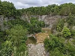 Taughannock Falls' main cataract is a 215-foot drop (66 m),[2] making it 33 feet (10 m) taller than Niagara Falls. It is the tallest single-drop waterfall east of the Rocky Mountains.[3][4] The waterfall is located along the creek, which flows through a long gorge with cliffs up to 400 feet (120 m) high.